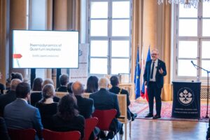 Later, Prof. Peter Samuely from the Institute of Experimental Physics of the Slovak Academy of Sciences (IEP SAS) in Košice, head of the group that collaborates with the laureate,  addressed the audience. He highlighted Ch. Marcenat’s extensive expertise in low-temperature physics and described the close cooperation with the Centre of Low Temperature Physics (CLTP) at the IEP SAS. As he noted, together with his colleagues in Košice, Dr. Marcenat has achieved several groundbreaking results.